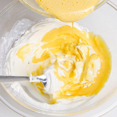 Incorporamos las yemas montadas al queso mascarpone (ya trabajado a parte) y mezclamos hasta que se integren perfectamente.