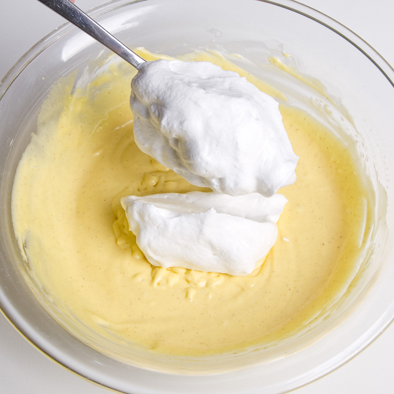 Incorporamos la nata montada azucarada, mezclando suavemente de abajo arriba.