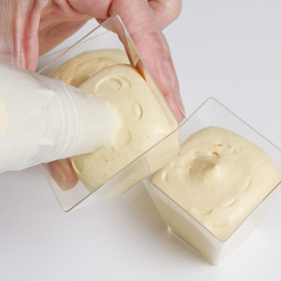 Ponemos el mascarpone en una manga pastelera y lo distribuimos en vasitos.