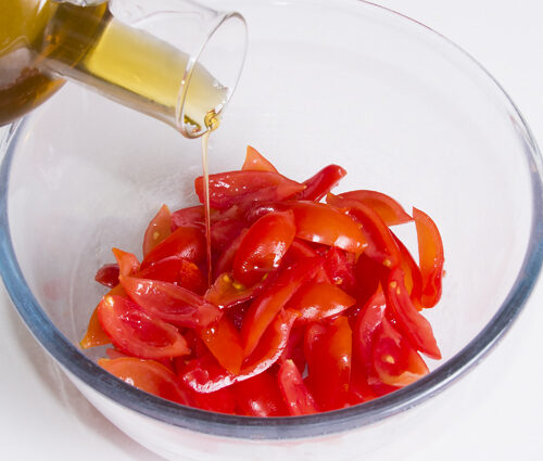 Facciamo un’altro strato così e poi sull’ultimo decoriamo con dei ciuffi di crema, alcuni pomodorini e le zucchine e spolveriamo di origano.