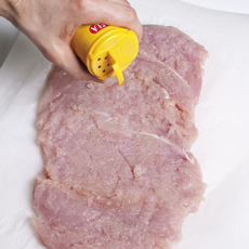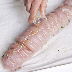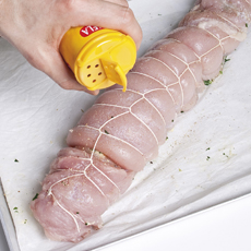 Arrotolate la carne, legatela, poi conditela esternamente con l’insaporitore massaggiando l’arrosto.