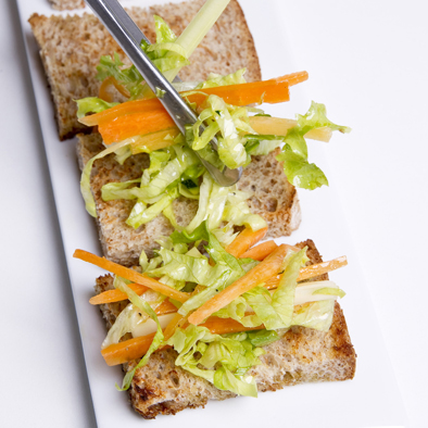 Tostate le fettine di pane e sovrapponete le verdure, quindi ricoprite con mezza fettina di prosciutto crudo. Servite immediatamente.