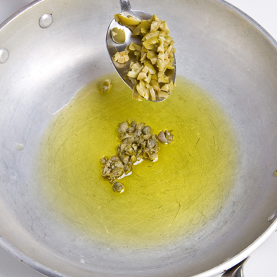 Sugo pomodoro e olive: in una seconda padella rosolate in olio i capperi con la metà delle olive tritati.