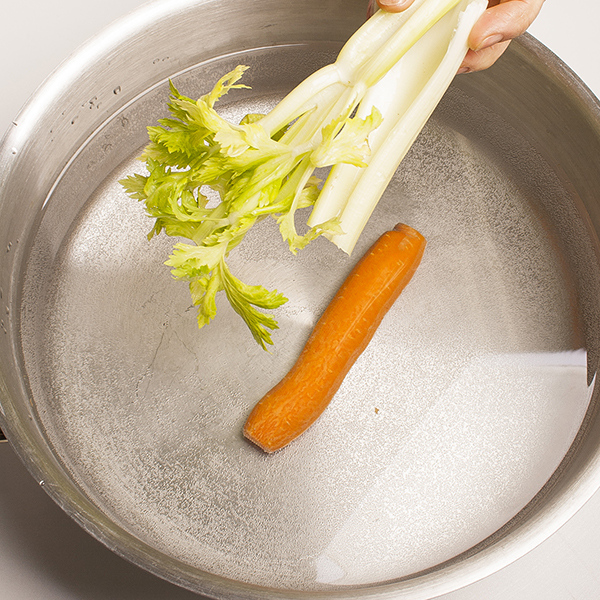 In una pentola portare a bollore l’acqua con le verdure mondate.