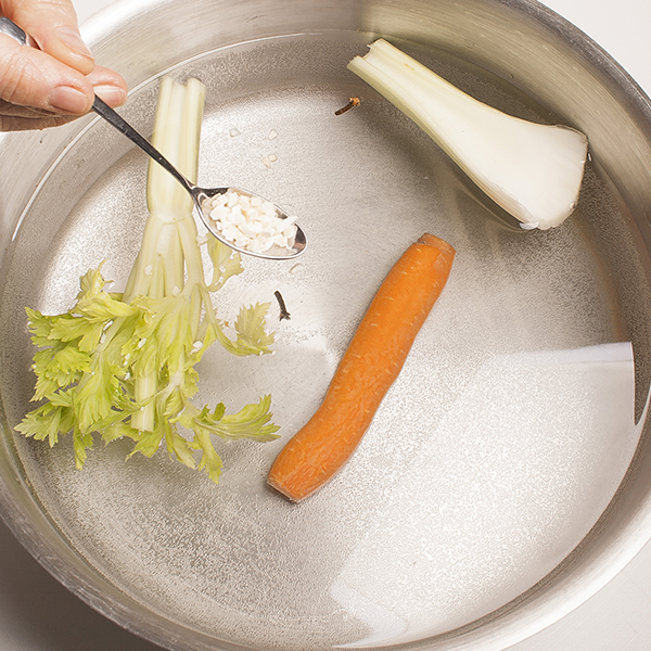 Aggiungere i chiodi di garofano interi CANNAMELA, la cipolla liofilizzata CANNAMELA e il pepe nero grani CANNAMELA. Salare.