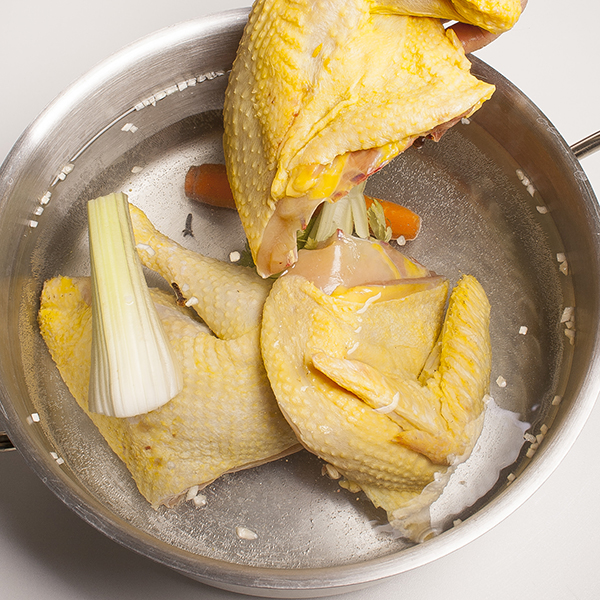 Introdurre in pentola il cappone diviso in quarti e cuocere per 90 min circa.