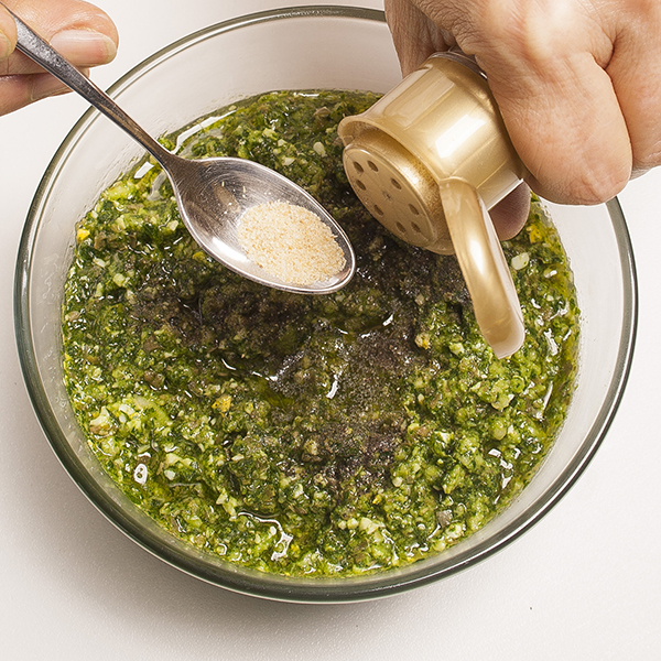 Completare con la mollica di pane, tritare ancora, unire l’olio e aromatizzare con l’aglio macinato CANNAMELA e il pepe nero macinato CANNAMELA mescolando bene. Controllare la sapidità.