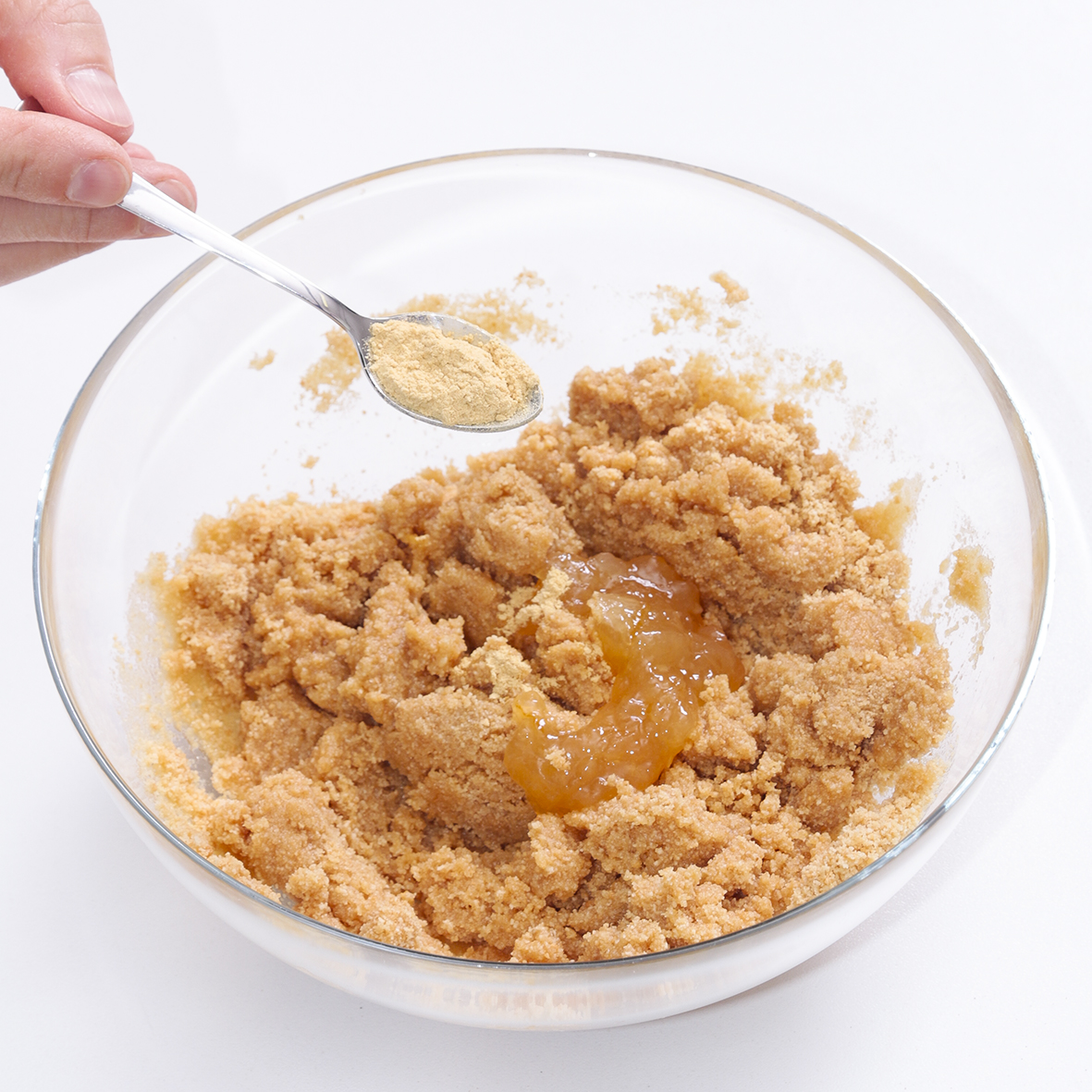 Base: polverizzare i biscotti e impregnarli con il burro fuso e freddo e la marmellata. Aromatizzare con lo zenzero macinato Bio Cannamela.