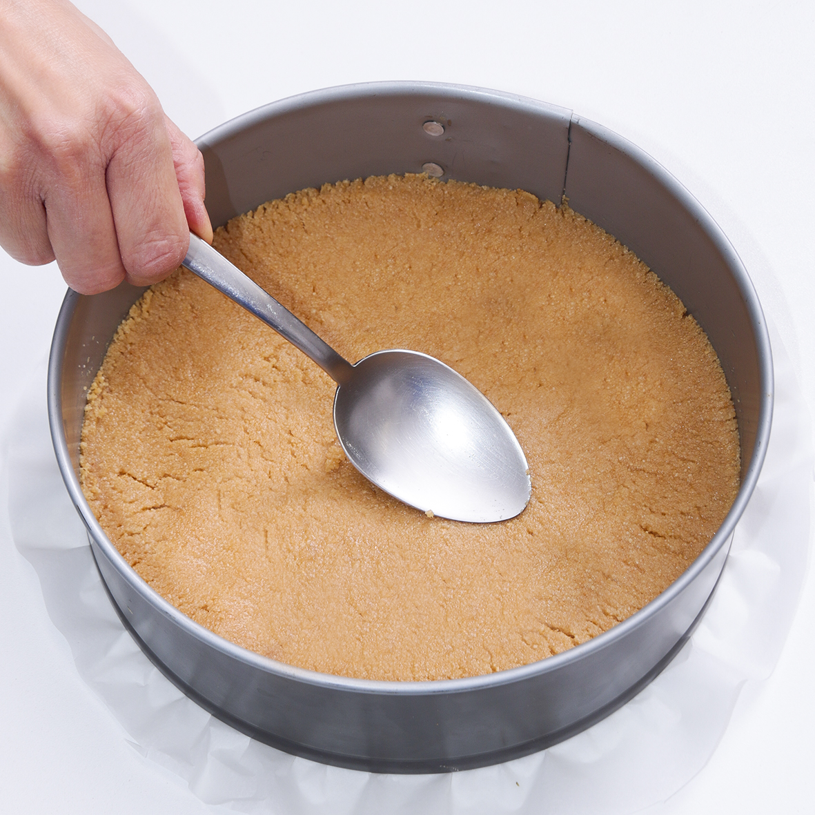 Compattare la biscottata sul fondo di uno stampo di Ø 22 cm, foderato sul fondo con carta-forno e conservare in frigo.