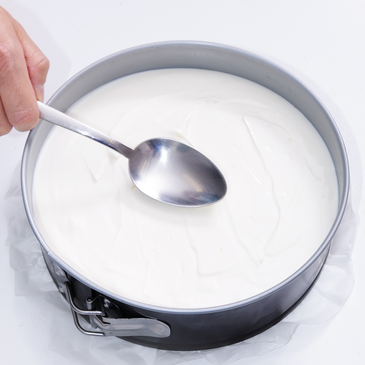 Versare la farcia sulla biscottata e livellarla. Riporre lo stampo in frigorifero per alcune ore.