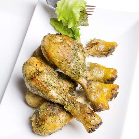 Servire le cosce di pollo con un contorno di insalata mista.
