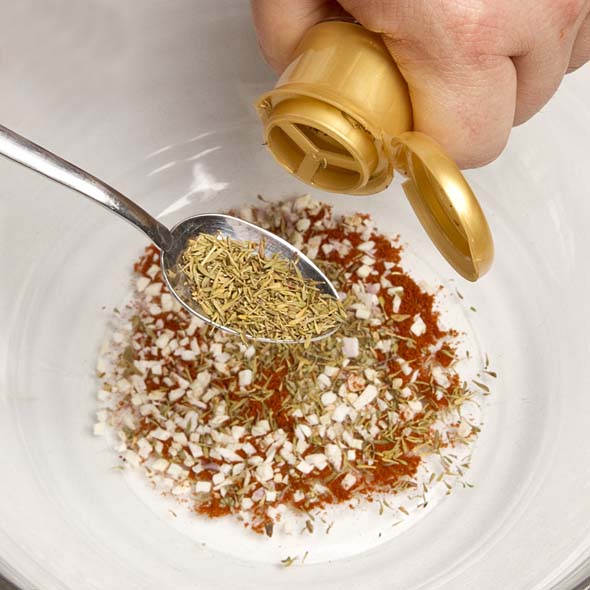 In una ciotola capiente riunire lo scalogno liofilizzato CANNAMELA, la cipolla liofilizzata CANNAMELA, la maggiorana in foglie serie oro CANNAMELA, la paprika dolce serie oro CANNAMELA, poi completare con il timo in foglie serie oro CANNAMELA.