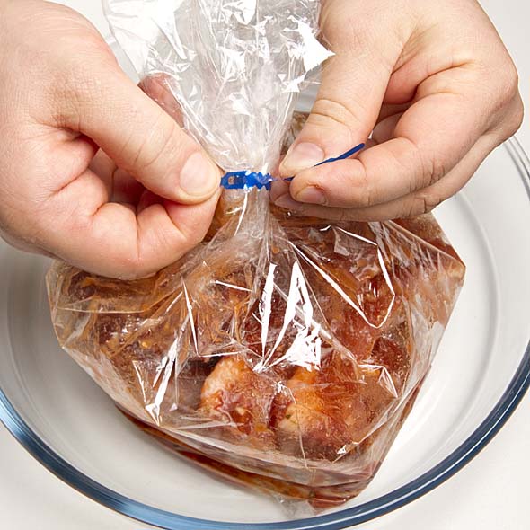 Aggiungere le costine con tutto il condimento e chiudere il sacchetto forno Cuki con l’apposito legaccio.
