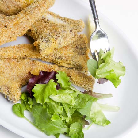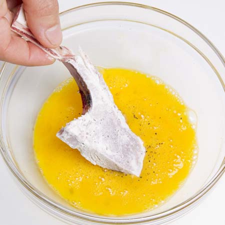 Friggere le costolette in olio caldo, oppure cuocerle in forno a 180° per 12  min dopo averle leggermente unte.