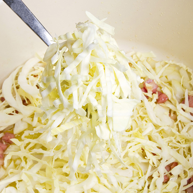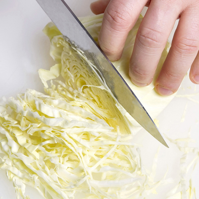 Tagliate il cavolo cappuccio a striscioline, immergetelo in acqua fredda per 30 minuti circa, poi scolatelo bene.