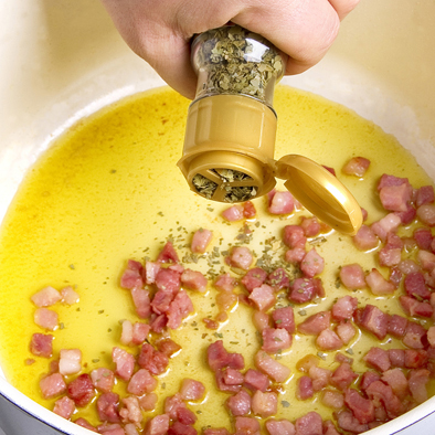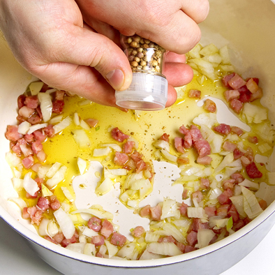 Ponete sul fuoco una casseruola con l’olio, la pancetta, l’ Alloro frantumato Serie Oro CANNAMELA e due giri di Pepe Nero Tappomacina CANNAMELA.