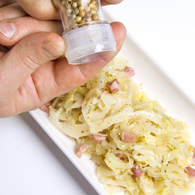 Quando i crauti sono pronti, distribuiteli nei piatti e completateli con due giri di Coriandolo Tappomacina CANNAMELA.