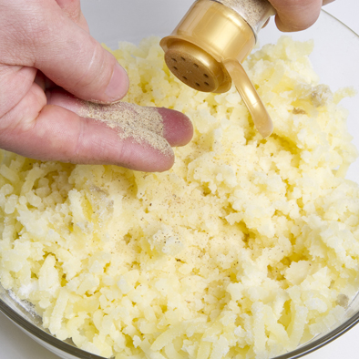 Trasferite la purea in una ciotola, salatela e insaporitela con un pizzico di Pepe Bianco Serie Oro CANNAMELA.