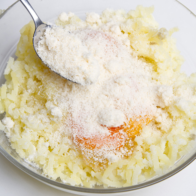 Lessate le patate in acqua salata e, quando saranno cotte, sbucciatele e passatele nello schiacciapatate.
