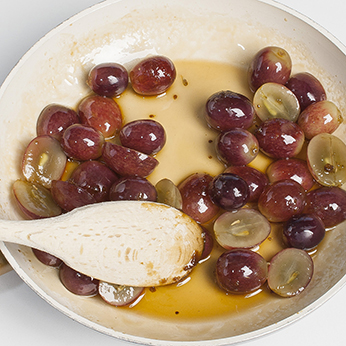Nel frattempo lavare l’uva e asciugarla. Tagliare alcuni acini a spicchi e farla cuocere per 2-3 min in padella con lo zucchero di canna. Lasciare intiepidire.