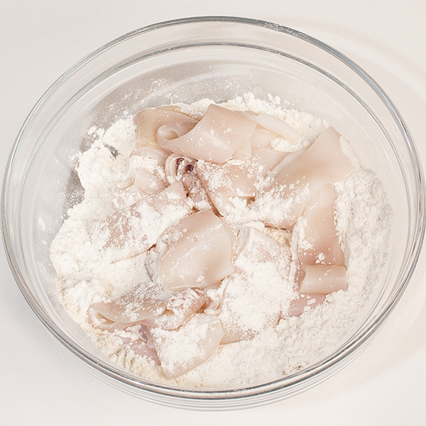 Infarinare i calamari eliminando la farina in eccesso.