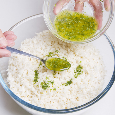 Trasferite il riso in una terrina e conditelo con l’emulsione mescolando bene.