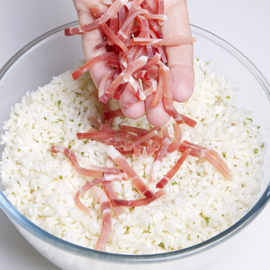Aggiungete al riso lo speck diviso a listarelle.