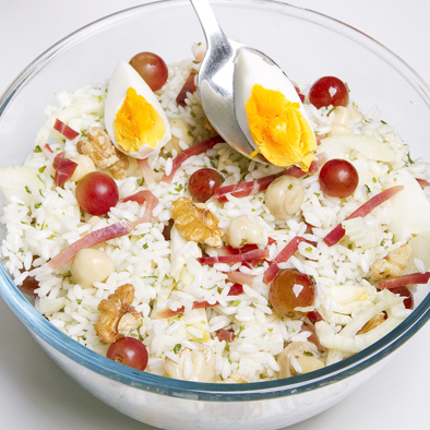Completate l’insalata di riso con gli acini d’uva, le noci tritate grossolanamente e le uova sode a spicchi.
