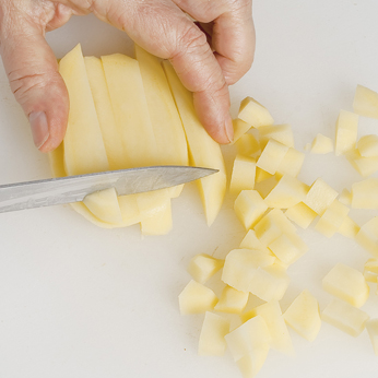 Tagliare a piccoli cubetti le patate e le carote.