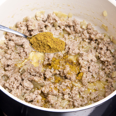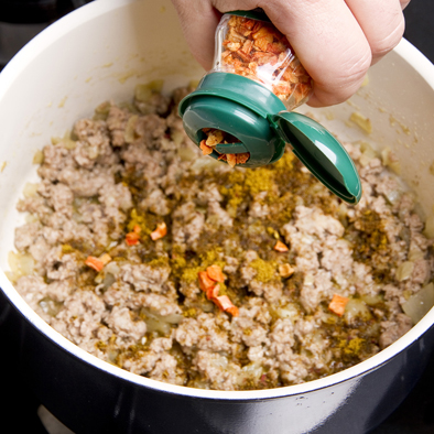 Dorate nell’olio la cipolla insieme con la carne, poi aggiungete 3 g di Spezie per Cous Cous Cannamela.