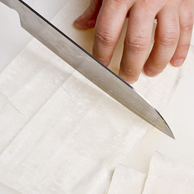 Adagiate tre fogli di pasta fillo sul piano di lavoro e tagliateli in rettangoli di cm 10 x 15.