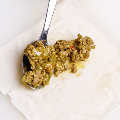 Adagiate al centro un cucchiaio di farcia e arrotolate ad involtino, sigillate bene con albume.
