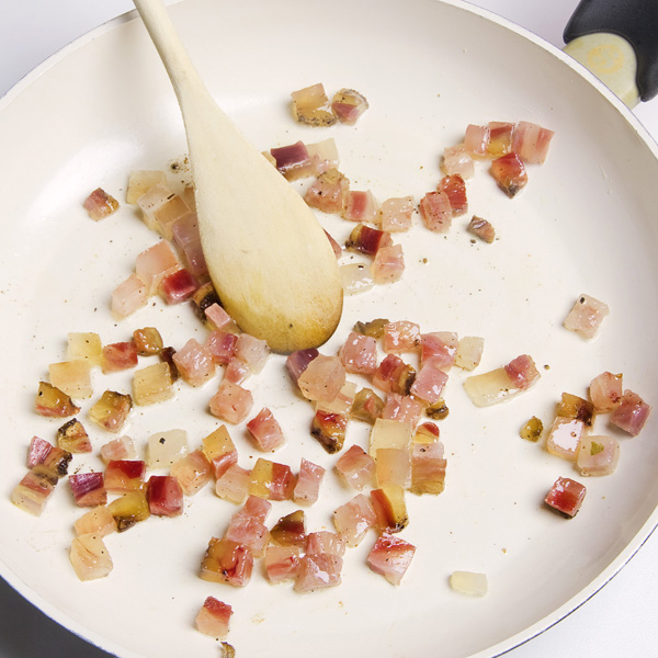 Cubettare il guanciale e rosolare il salume in pochissimo olio.