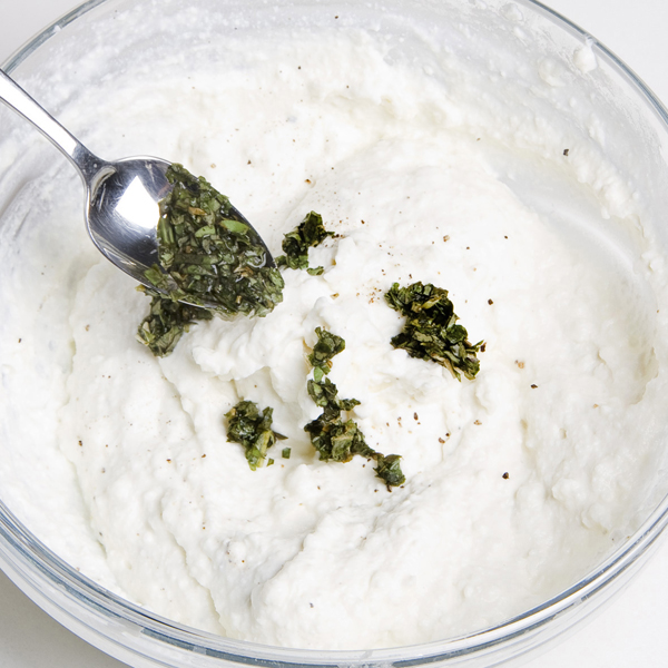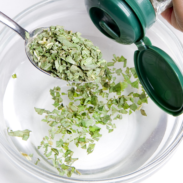 Inumidire per qualche min il basilico liofilizzato CANNAMELA in 1 cucchiaio di acqua.