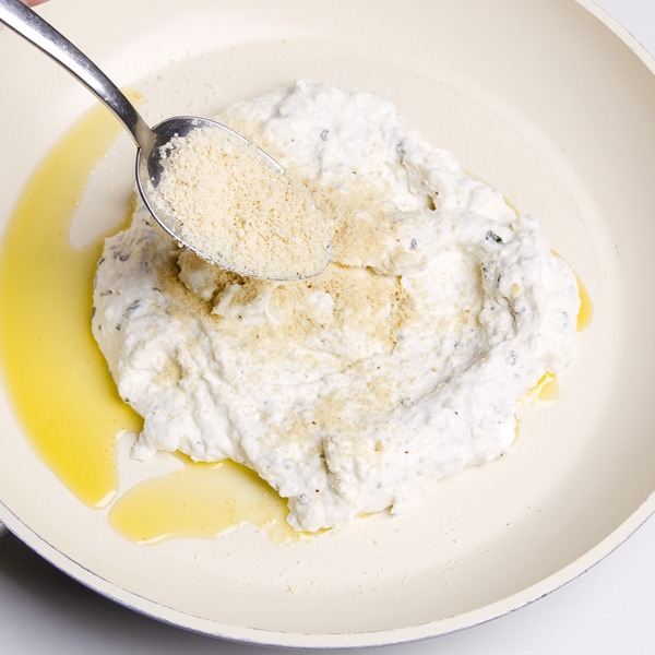 Scaldare l’olio e versare in padella il pesto di ricotta e le mandorle.