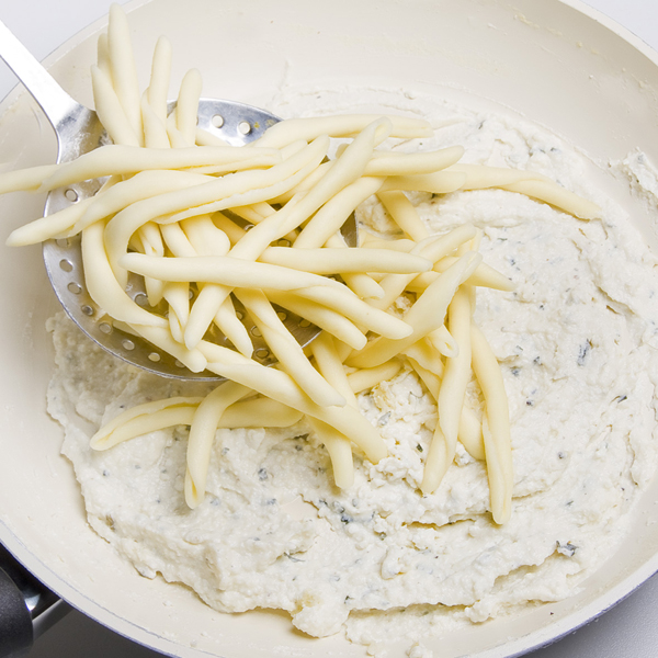 Lessare la pasta in acqua salata, scolarla al dente e passarla in padella con il sugo (se la ricotta dovesse risultare troppo soda, diluire il sugo con 2 cucchiai di acqua di cottura della pasta) e il formaggio pecorino grattugiato.