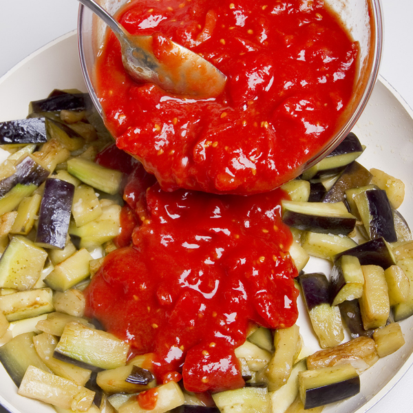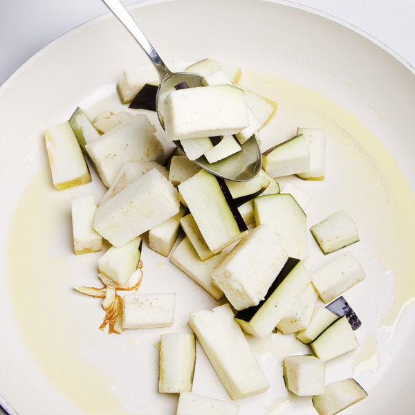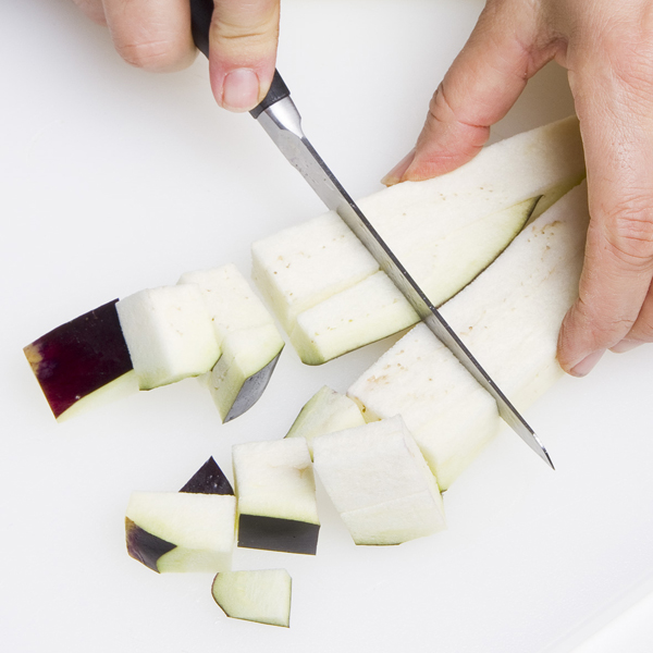 Lavare le melanzane, eliminare il picciolo e tagliare la polpa a cubetti.