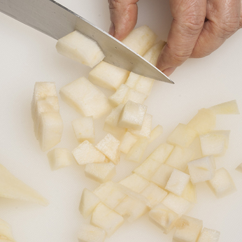 Sbucciare la pera, eliminare il torsolo e dividerla a dadini.