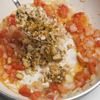 Nella stessa padellina soffriggere la cipolla tritata, poi unire il pomodoro a pezzettini. Proseguire la cottura per qualche min in modo che gli ingredienti siano amalgamati uniformemente.