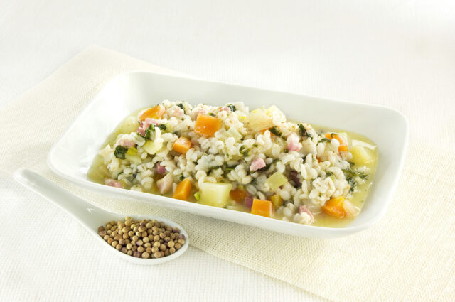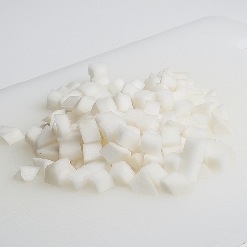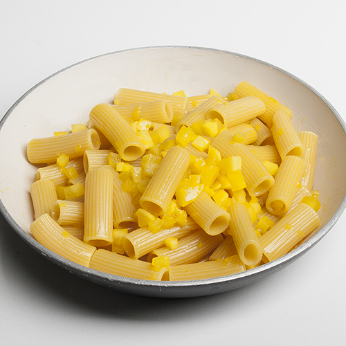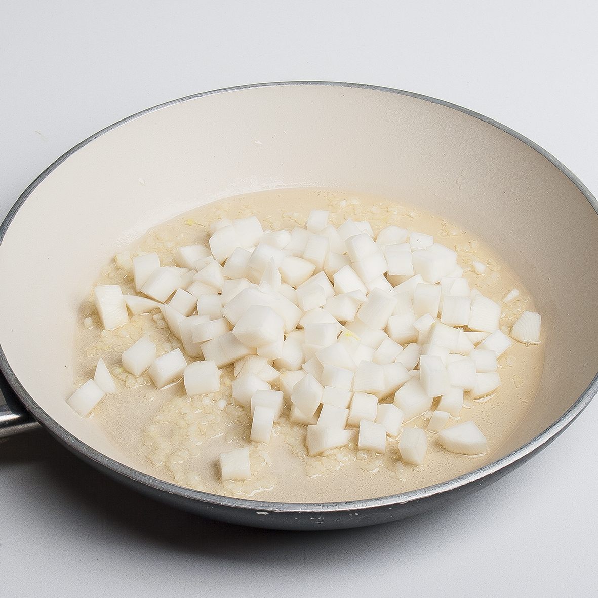 Porre sul fuoco e unire cipolla liofilizzata CANNAMELA, fare dorare, aggiungere i cubetti di rapa, rosolarli e salare.