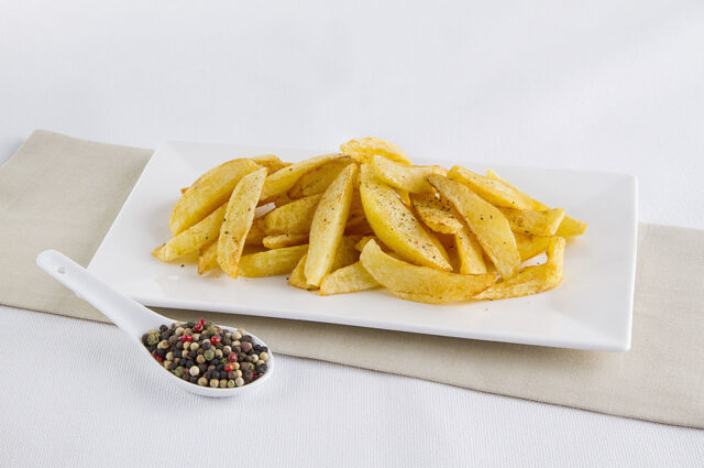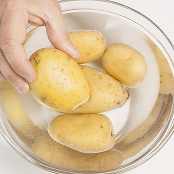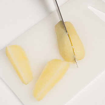 Prelevare le patate dal cestello, sbucciarle, poi tagliarle a grossi spicchi.
