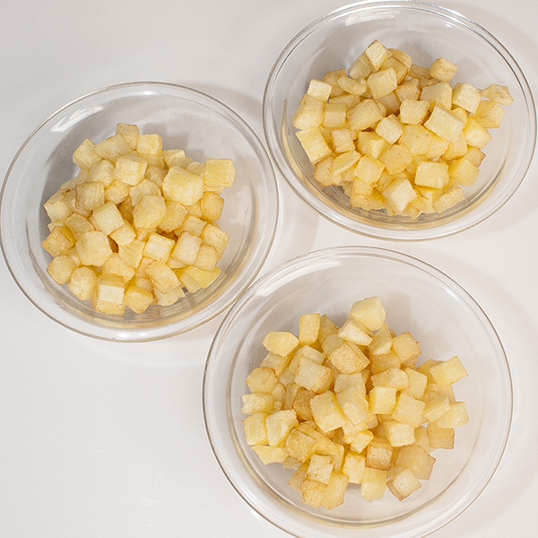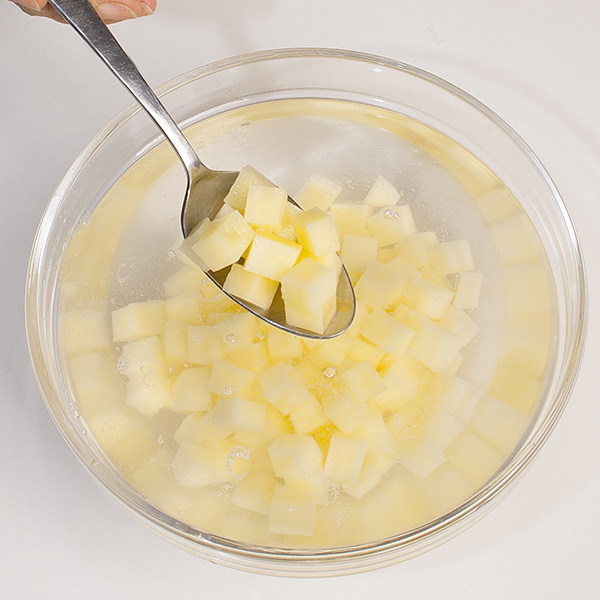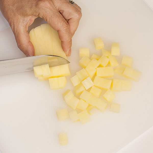 Sbucciare le patate e tagliarle a cubetti di circa 1 cm di lato.
