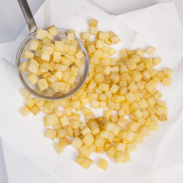 Immergere le patate nell’olio e cuocere fino a renderle croccanti.