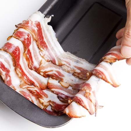 Foderare uno stampo da plum cake di 11X25 cm con le fette di pancetta stesa in modo che sbordino.