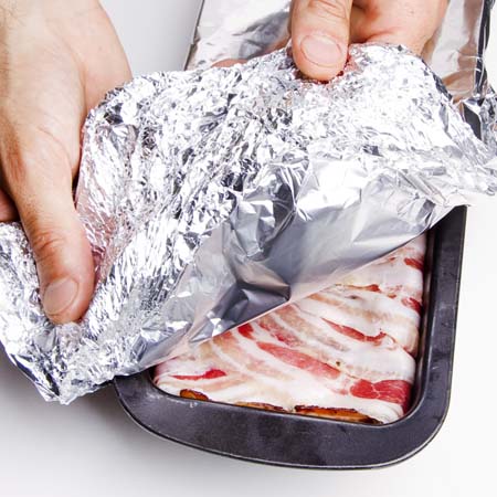 Richiudere il composto con le fette di pancetta. Coprire con un foglio di carta alluminio.