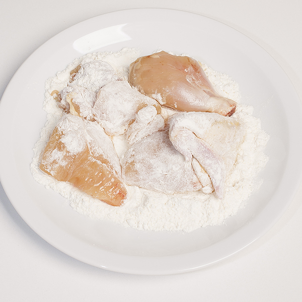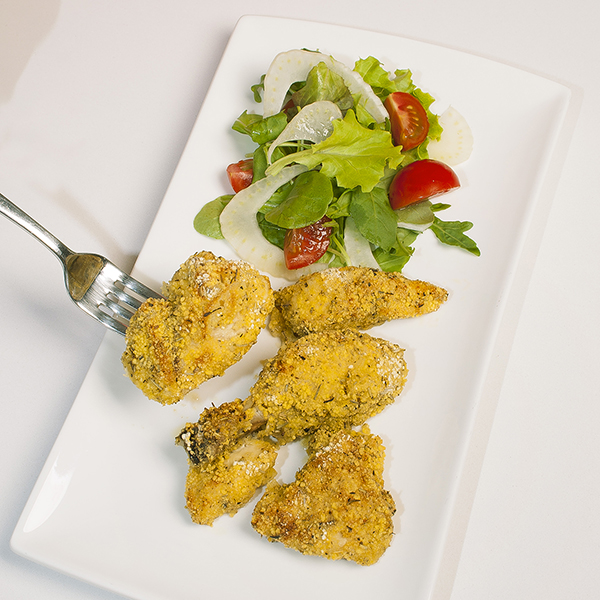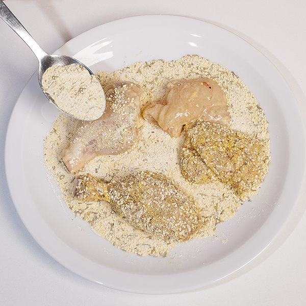 Intingere nell’uovo i pezzi di carne infarinati e passarli nel Panato Pronto preparato per impanatura mediterranea CANNAMELA.