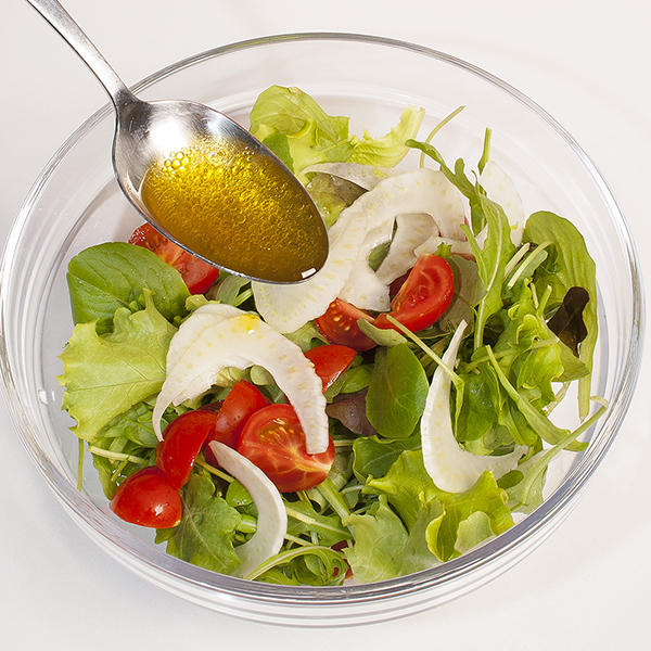 Emulsionare 1 cucchiaio d’olio e 1 di aceto di mele, salare e pepare.