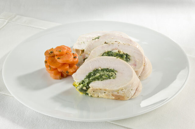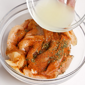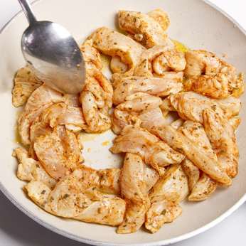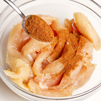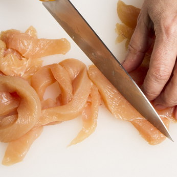 Tagliare a listarelle larghe 2 cm circa i petti di pollo.