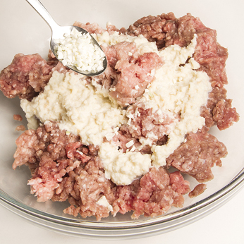 In una ciotola raccogliere il macinato di carne, poi unire la mollica di pane strizzata e la cipolla liofilizzata CANNAMELA.