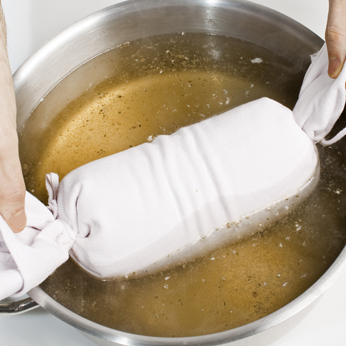 Legare con spago da cucina, poi immergerlo nel brodo.